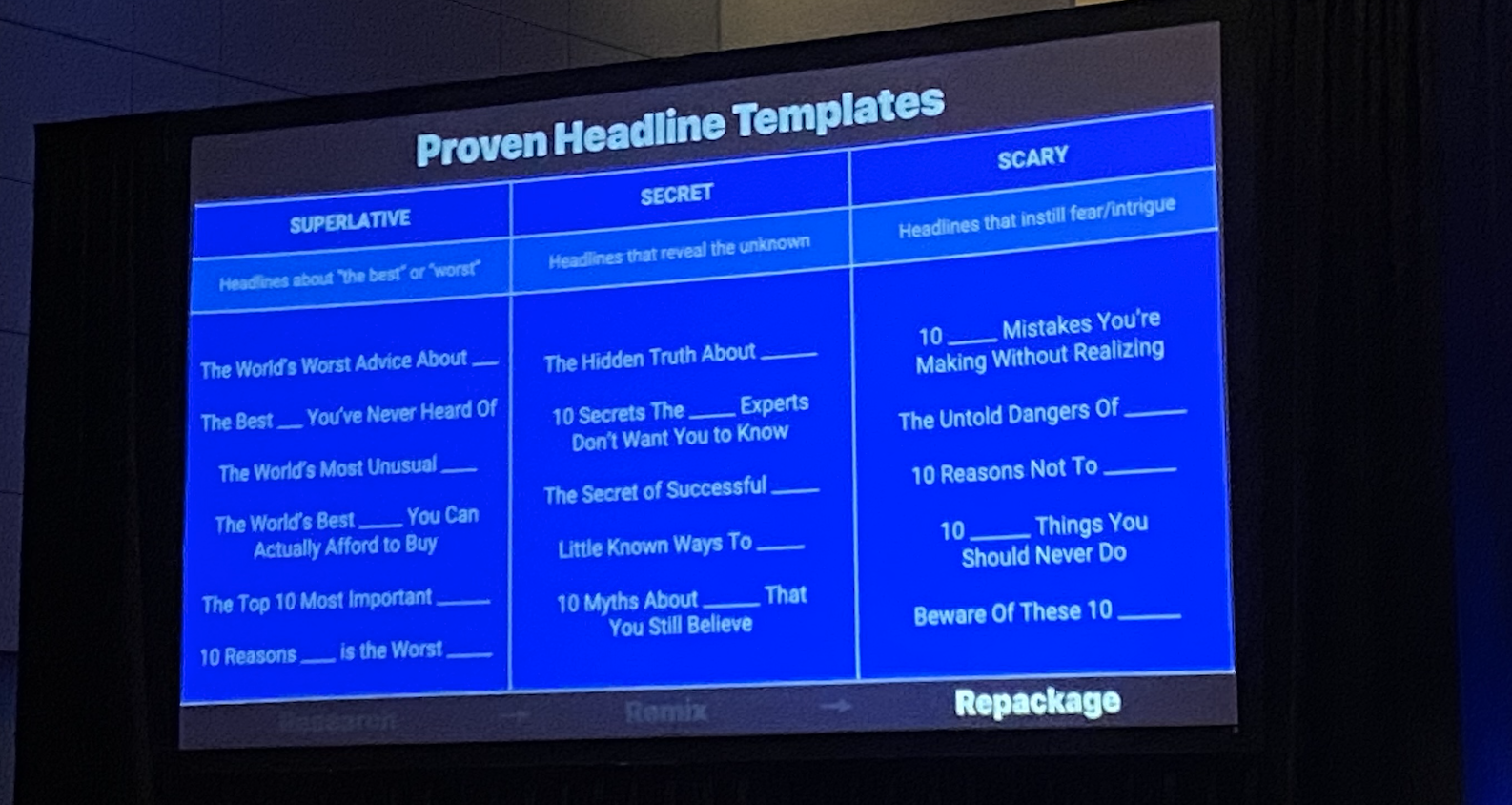 This also applies to headlines. Writing eye catching headlines can feel overwhelming, but Jon provided a template for some of the foolproof formulas for creating a clickable headline.