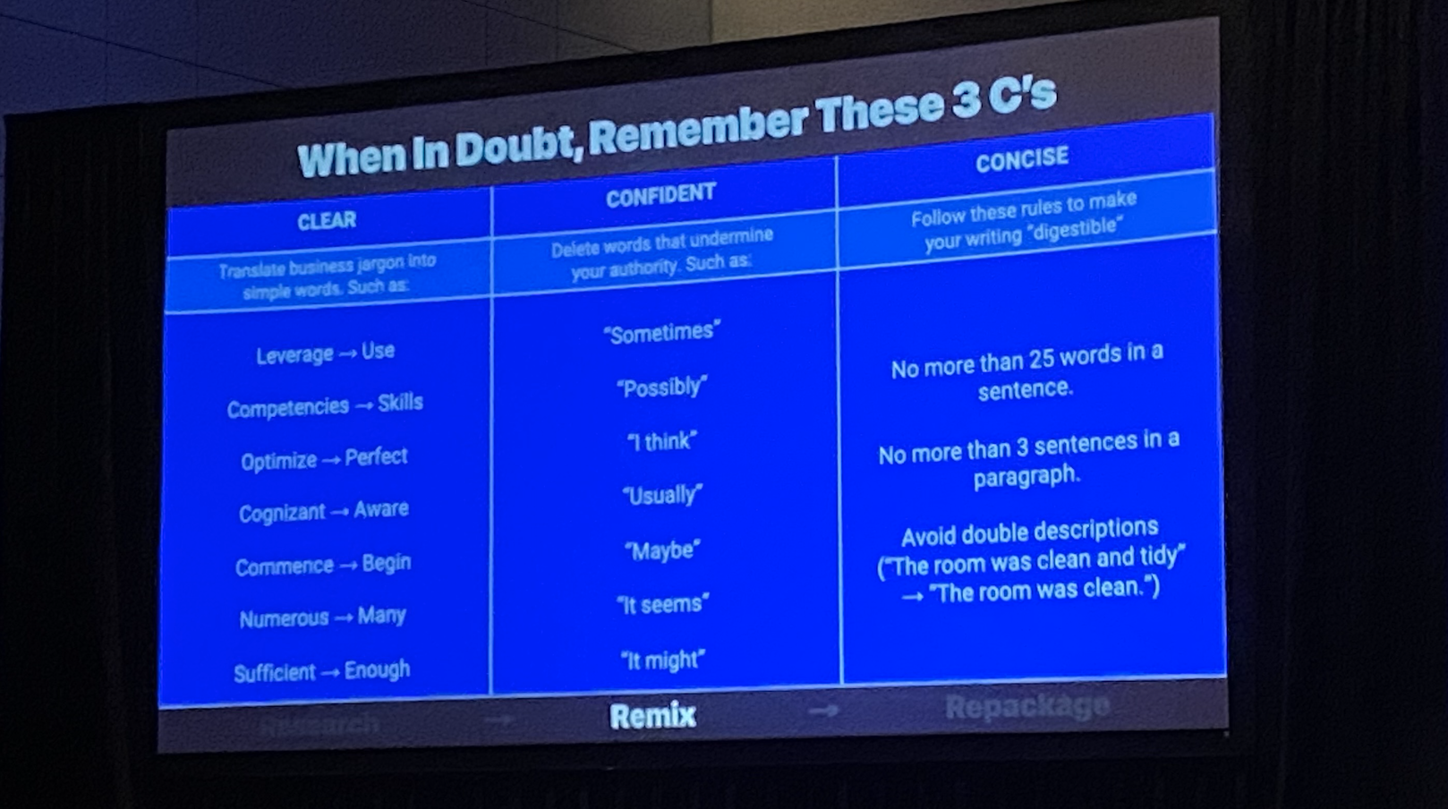 Our keynote speaker at the conference, Jon Youshaei, a former employee of Instagram and YouTube, focused on $0 marketing ideas, which should be music to every library’s ears! We learned a lot about the language we should be using in our marketing efforts. Although we may have patrons of varying ages and literacy levels, anything that we post should be at an 8th grade reading level. A great free tool called the Hemingway App allows users to input their copy and it will identify the reading level of the post so that it can be adjusted accordingly. Part of writing copy that gets your point across in a succinct way and is more digestible for your audience, is keeping it clear, confident and concise. Use simple terms, delete any words that undermine your authority, and clean up run-on sentences. Check out a chart of the Three C’s below: